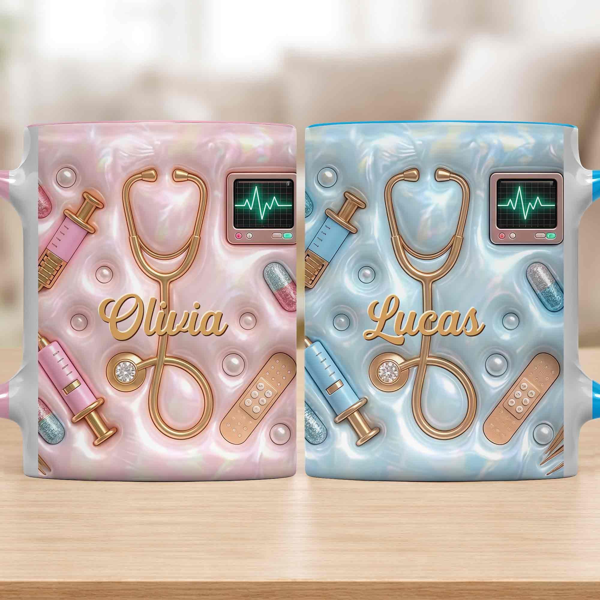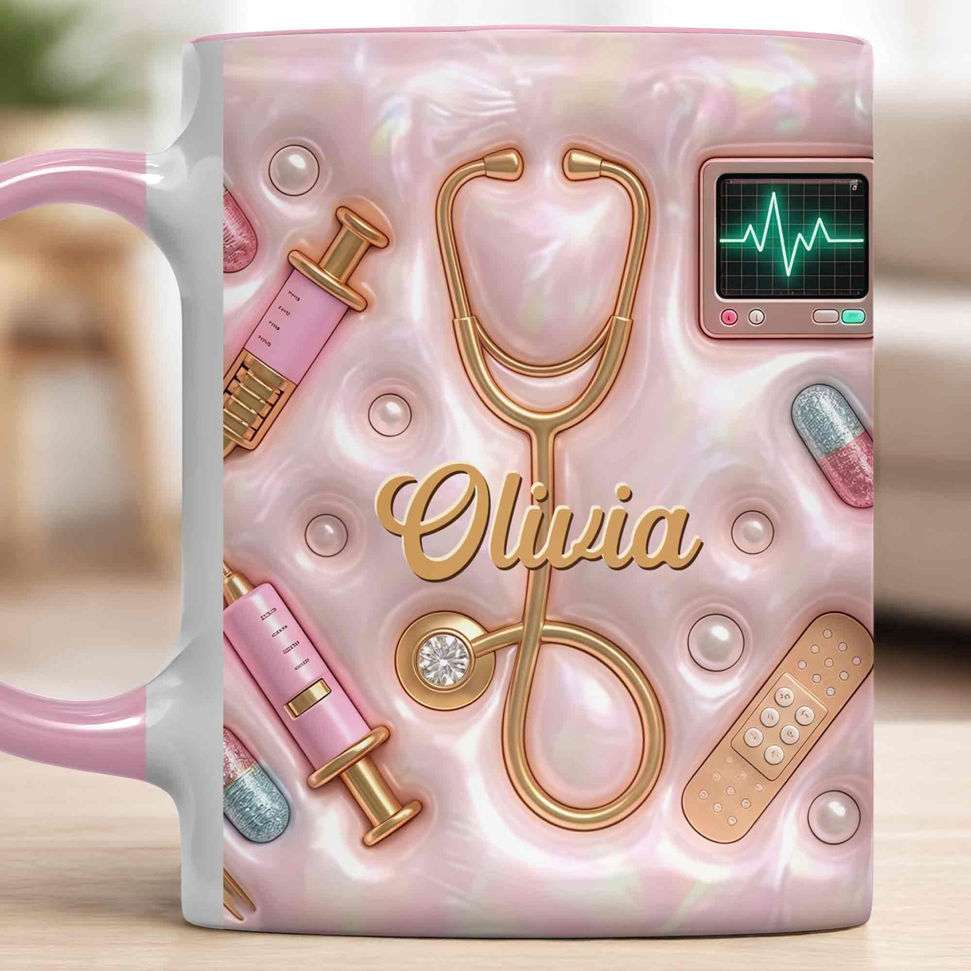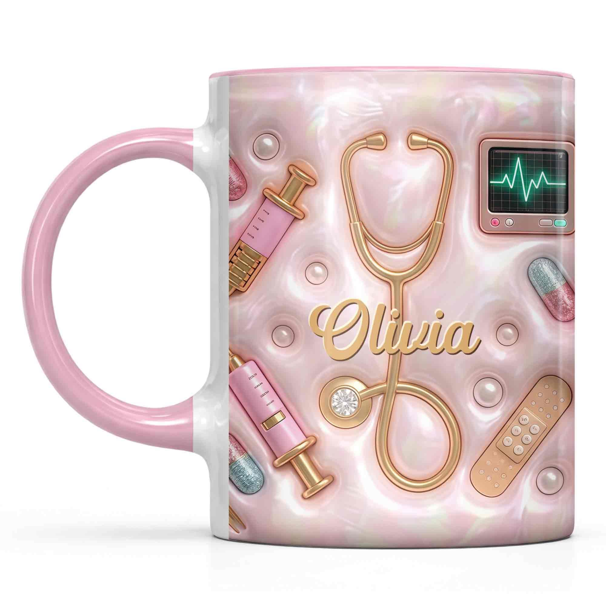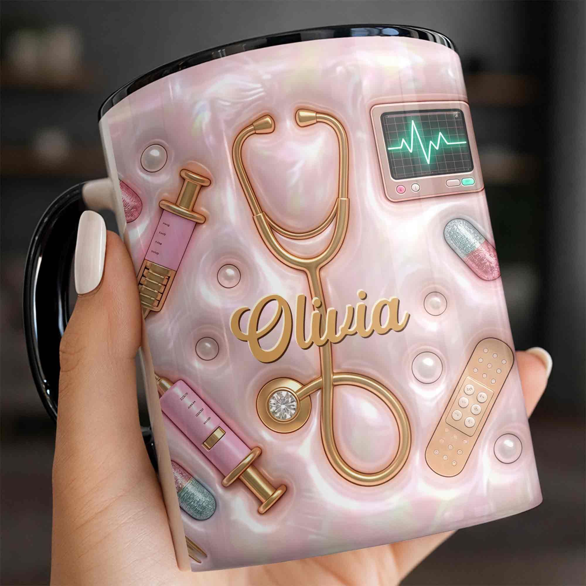 Geschenk für Krankenschwester – personalisierte Tasse mit 3D medizinischen Werkzeugen & Perlen-Design – liebevolle Wertschätzung für Pflegekräfte