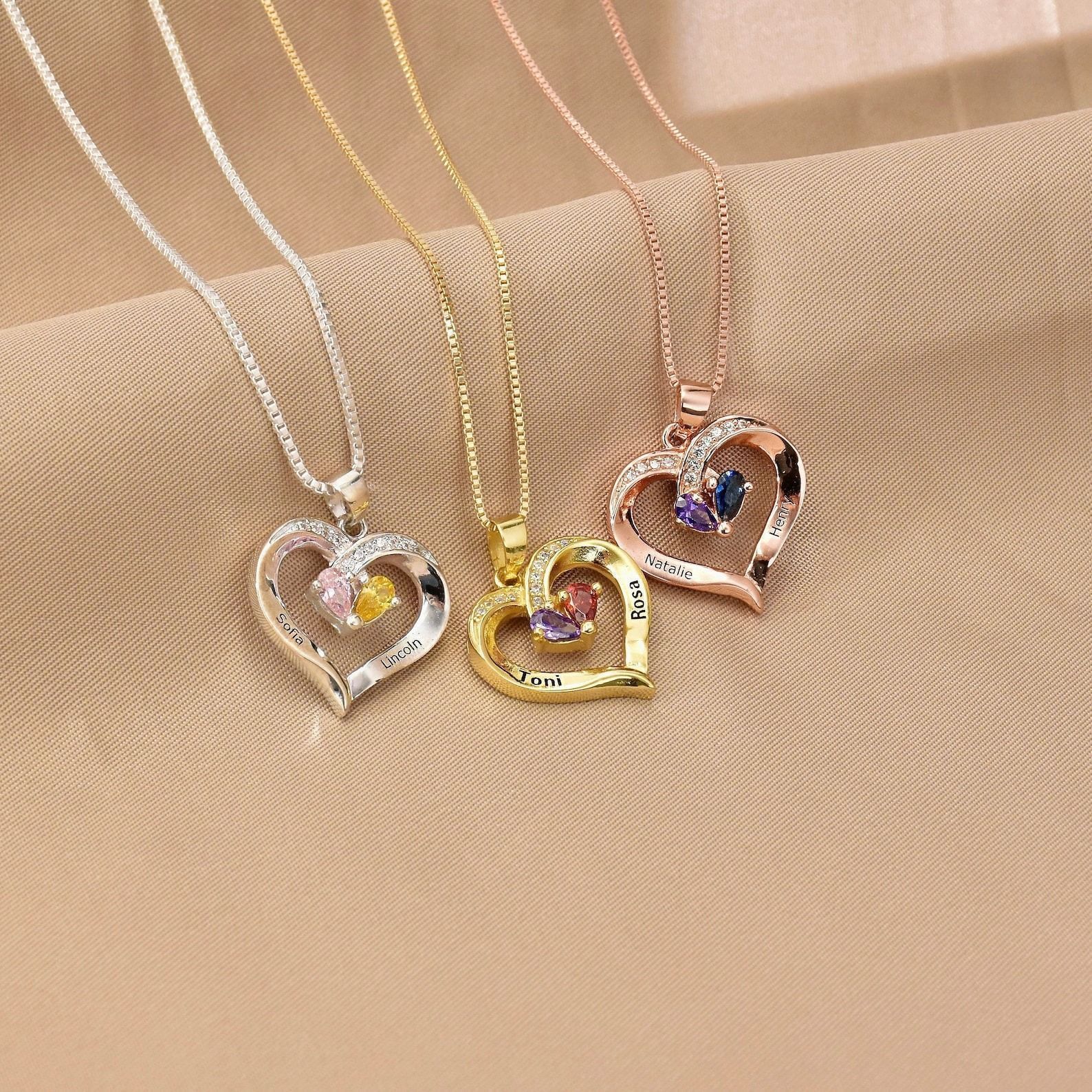 Eine personal isierte, zeitlose Halskette mit herzförmigem Anhänger, besetzt mit zwei Geburts steinen und auf Wunsch mit Namens gravur-das perfekte Valentinstag geschenk für Frauen.