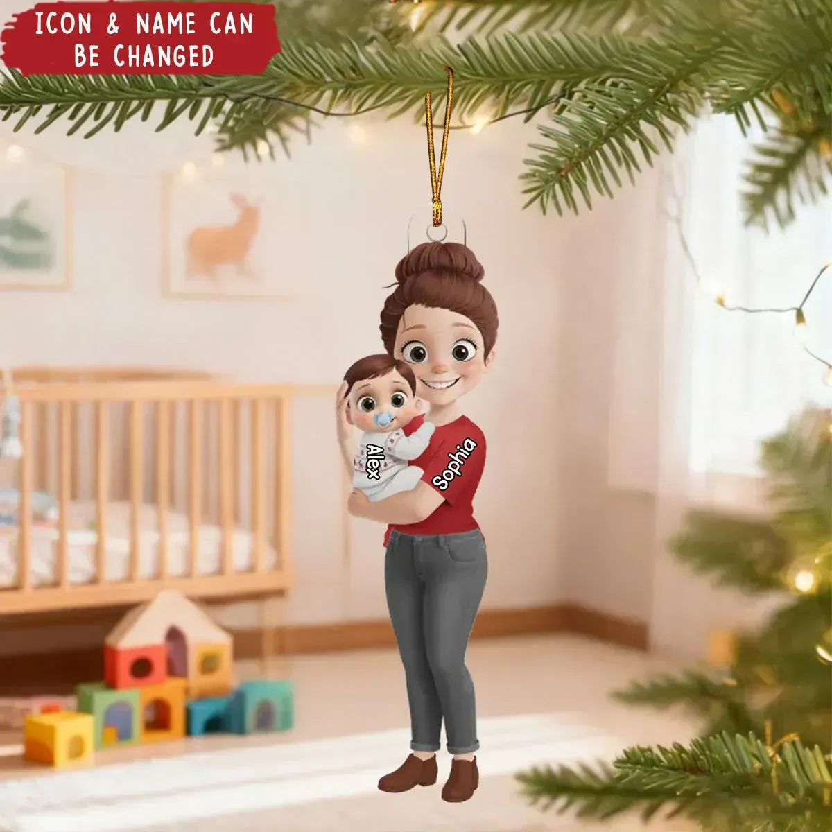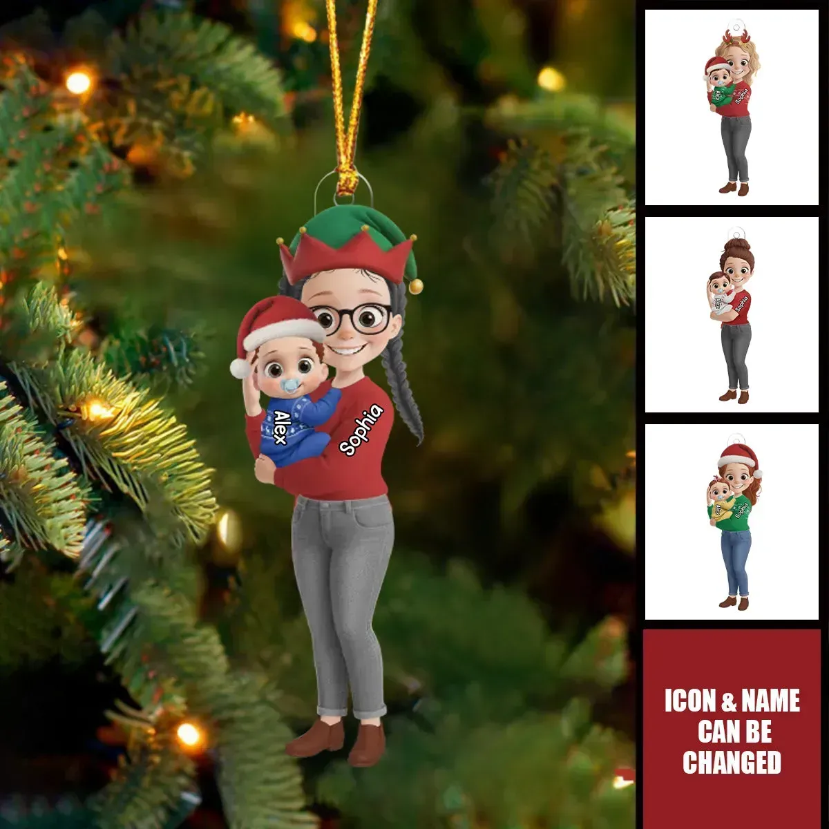 Personalisierte Acryl-Schlüsselanhänger und Acryl-Ornamente mit einer Mutter, die ein Baby hält, wobei das Geschlecht des Babys enthüllt wird – als Geschenk.
