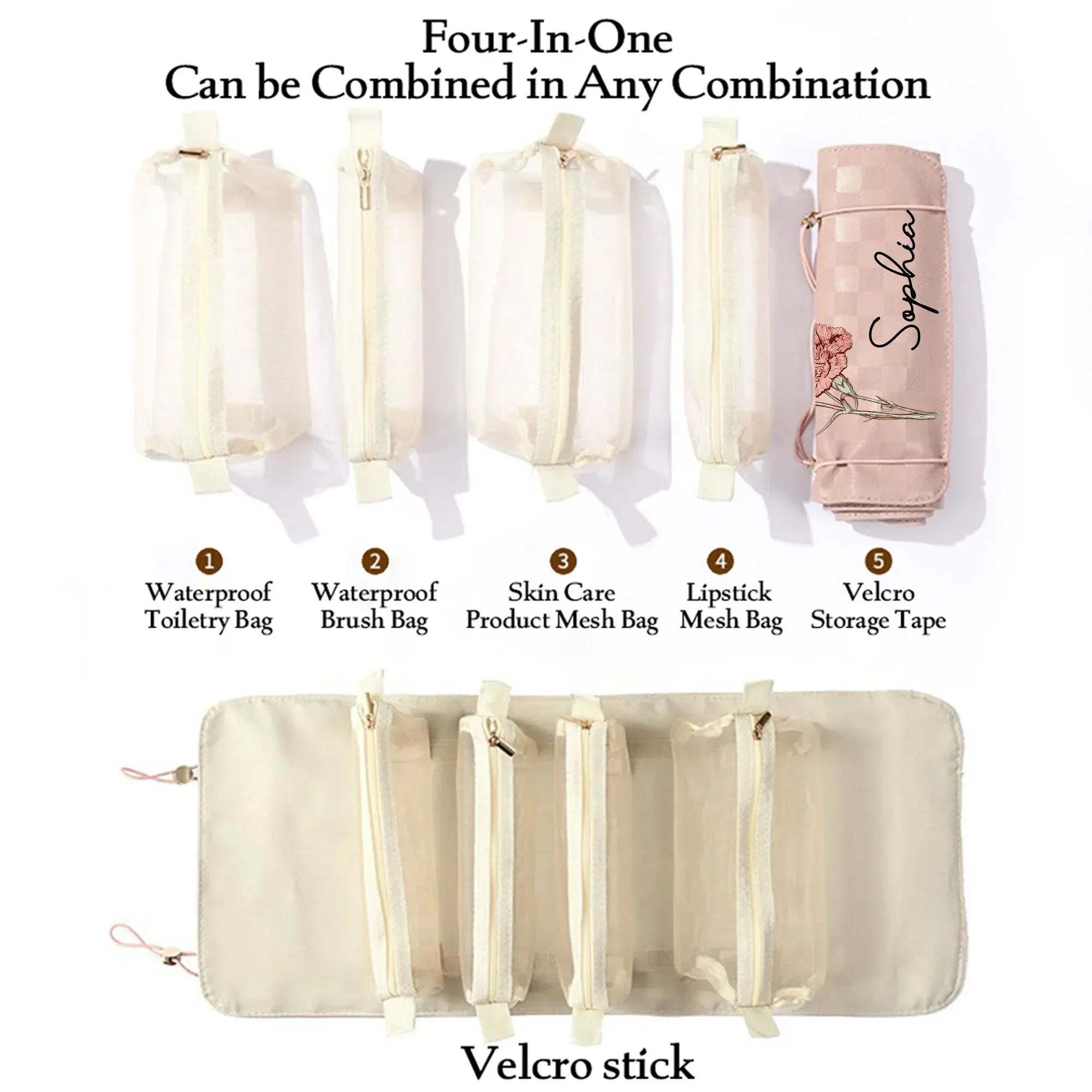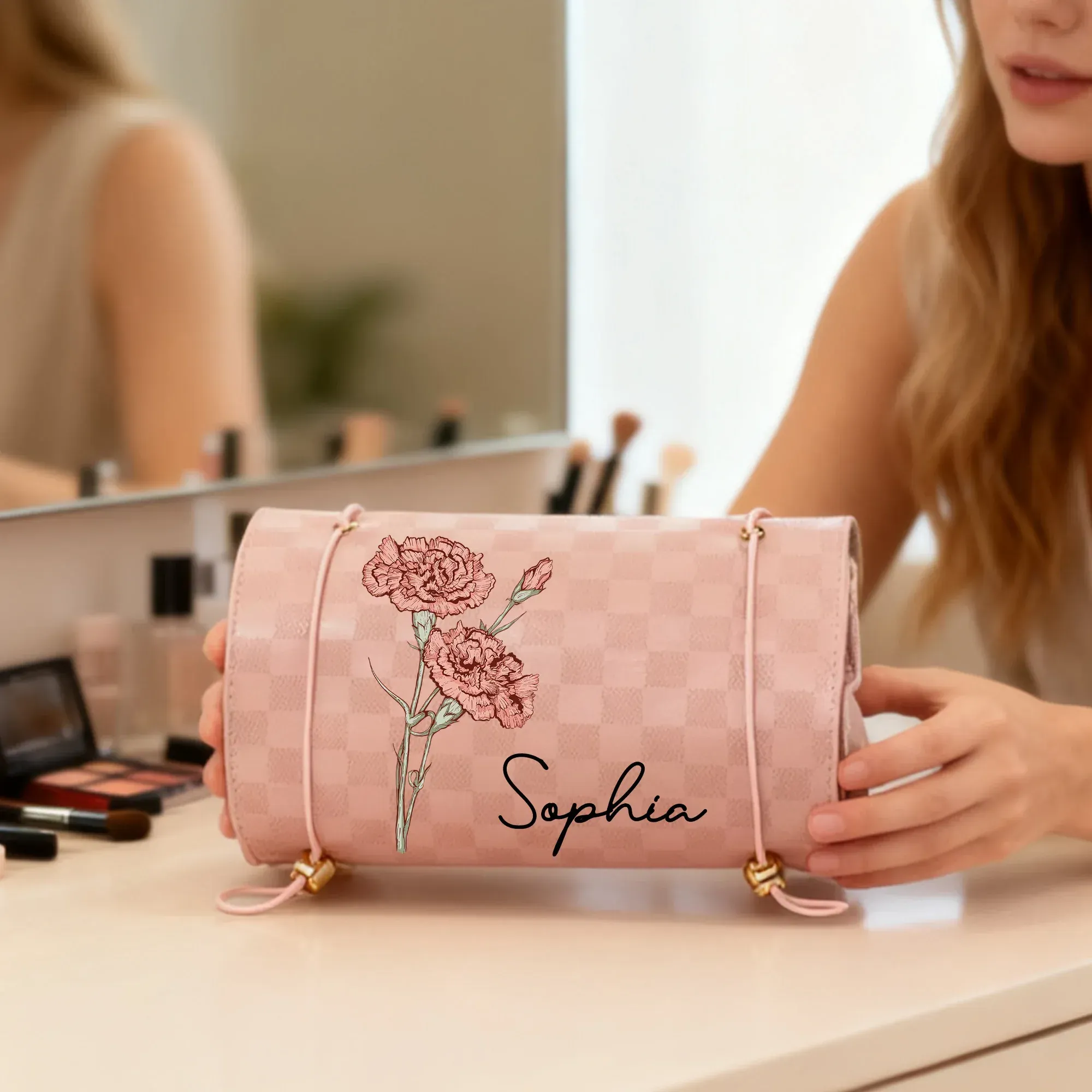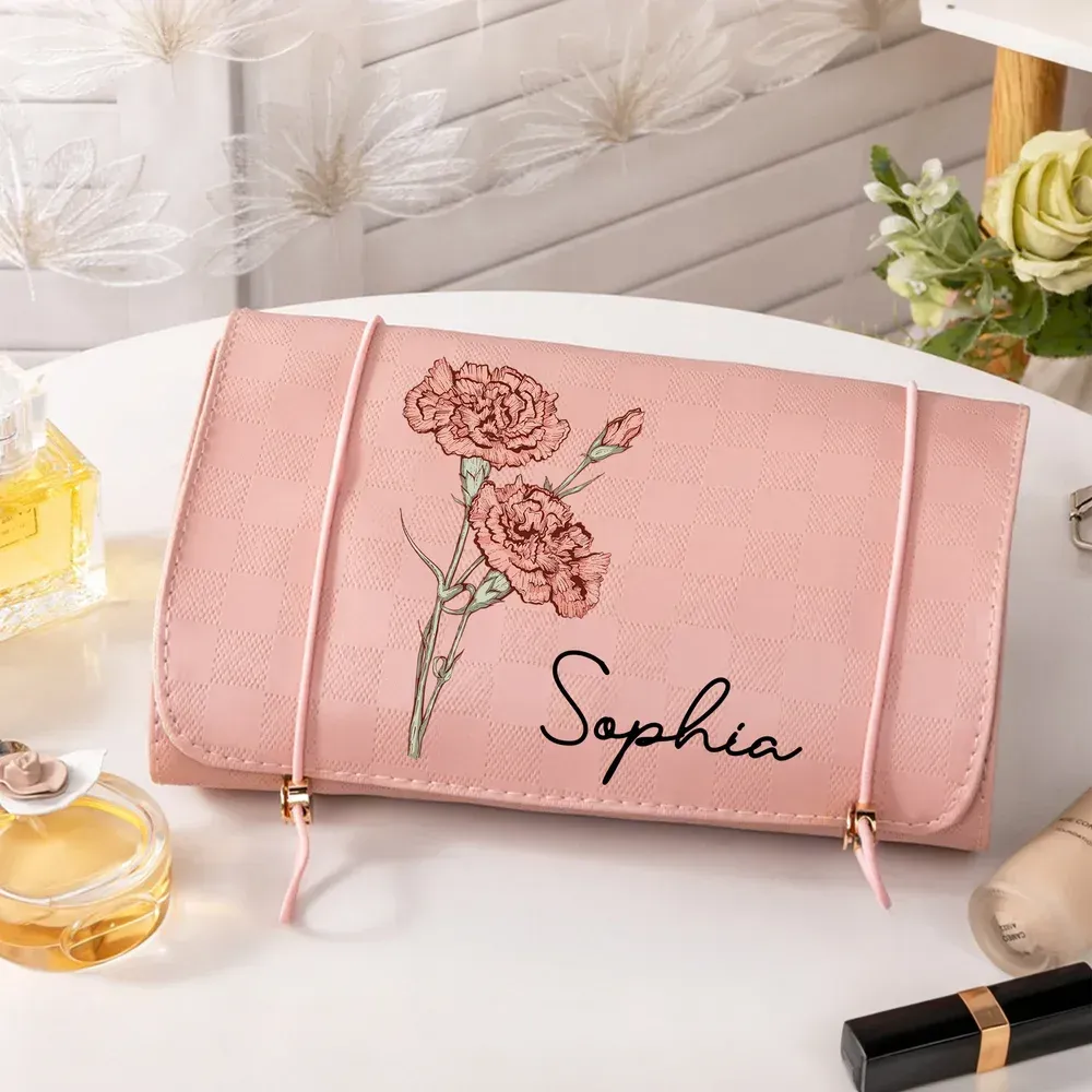 Personalized Birth Flower Dainty PU Leather Makeup Bag with Name Travel Essentials Daily Use Birthday Gift for Women